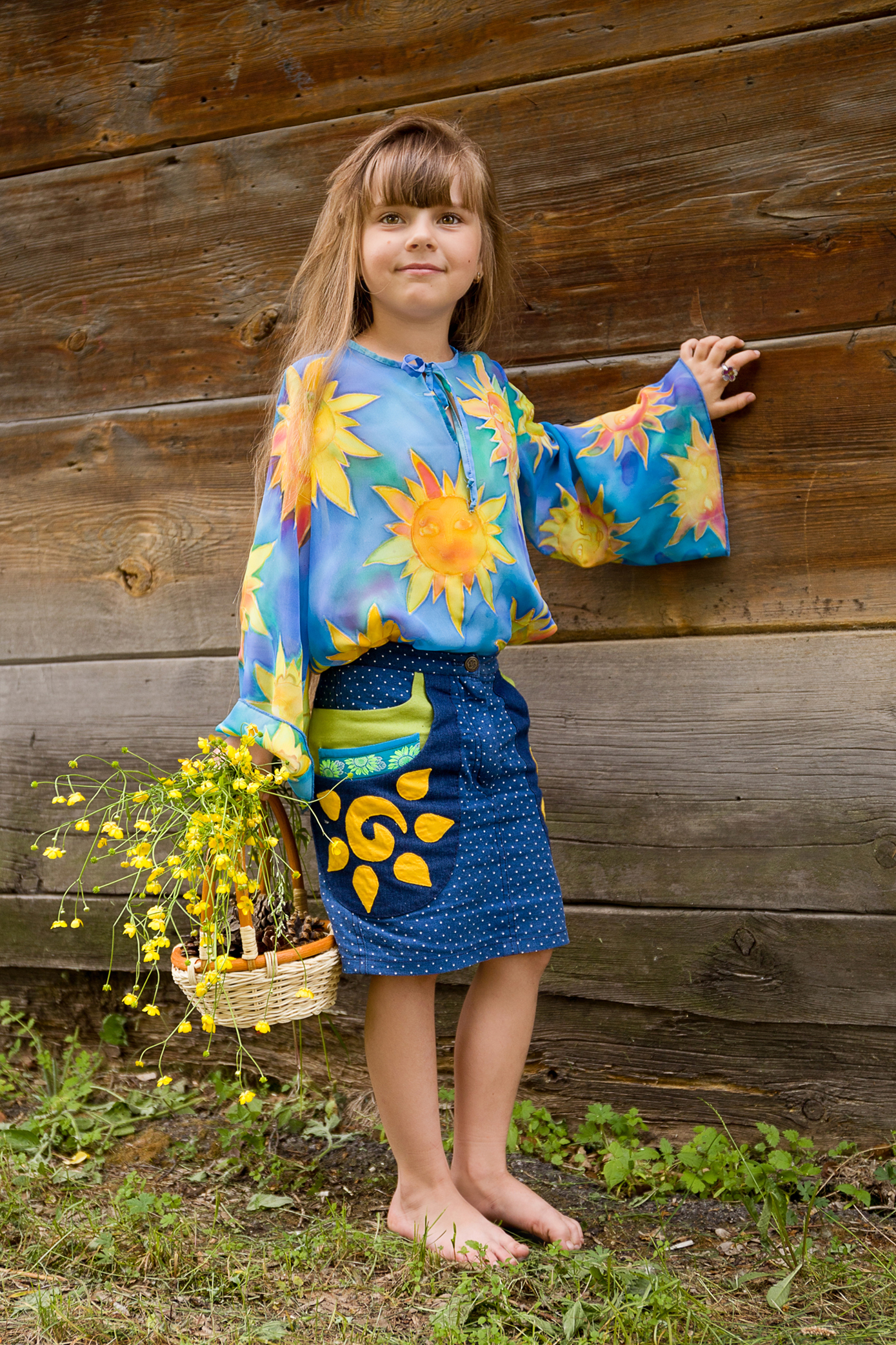 В коллекцию вошли модели, созданные для солнечных детей и их родителей. В каждом луке присутствует изображение солнца в технике холодного батика или в технике текстильной аппликации.