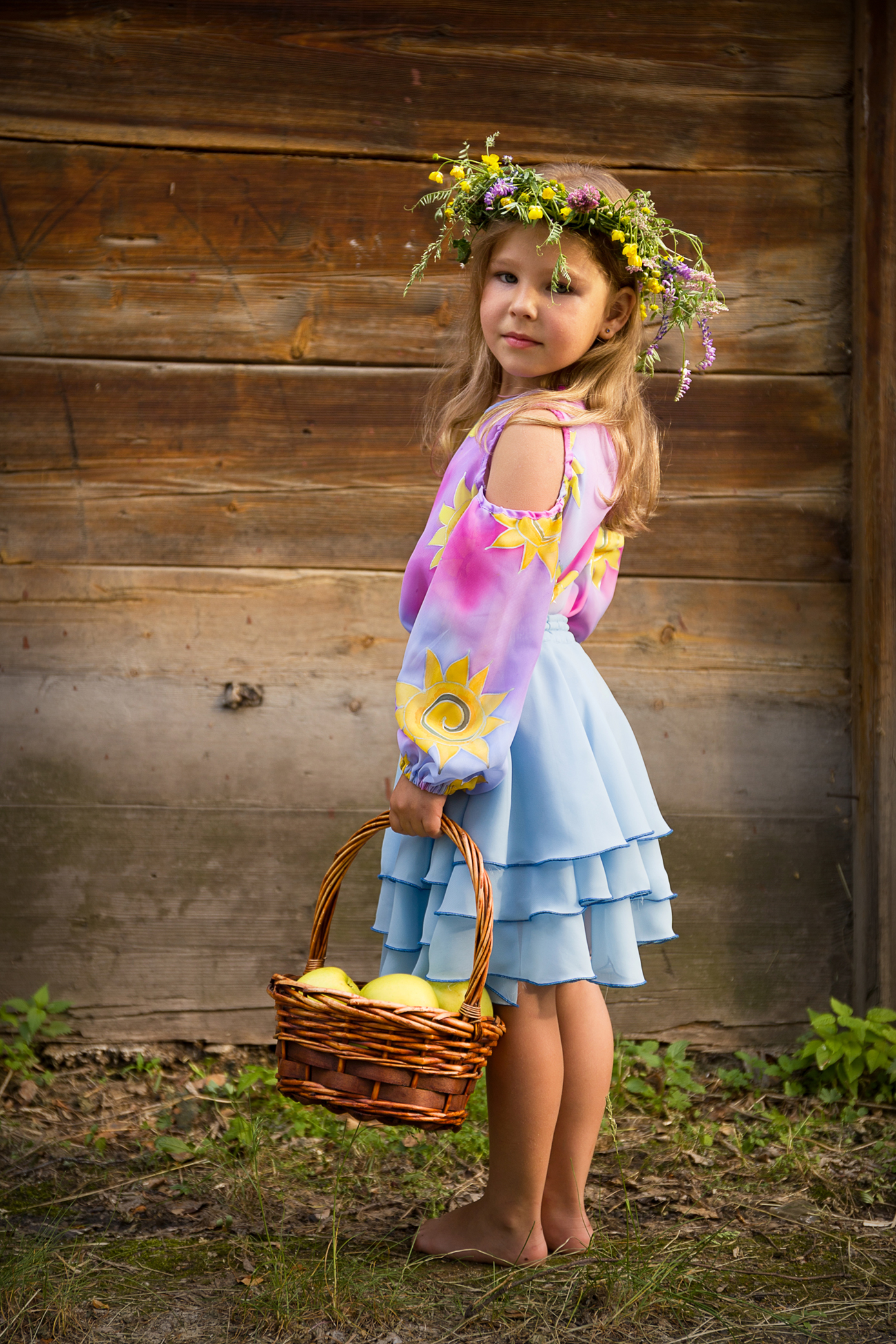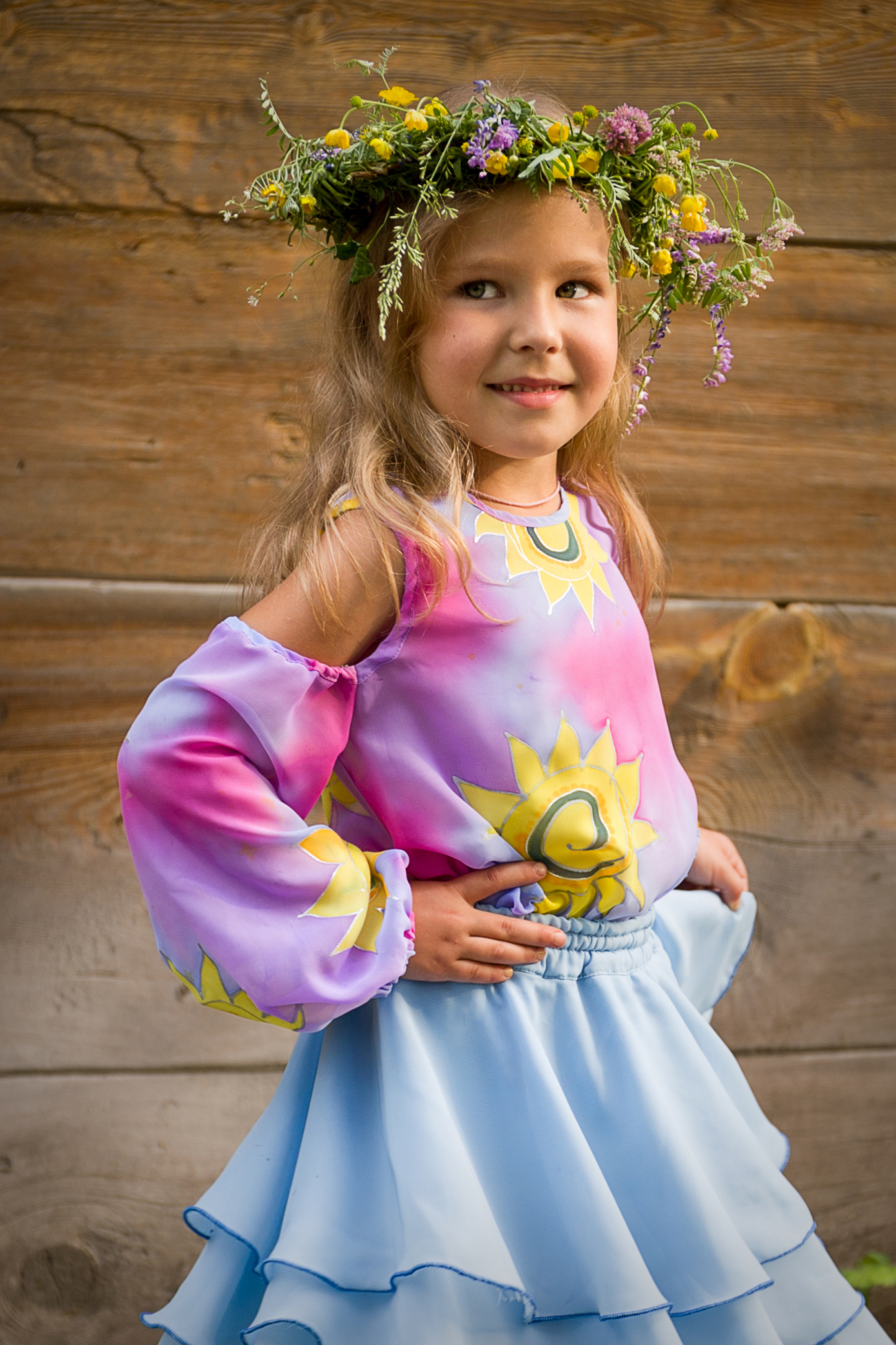 В коллекцию вошли модели, созданные для солнечных детей и их родителей. В каждом луке присутствует изображение солнца в технике холодного батика или в технике текстильной аппликации. Также модели сшиты на сестер солнечных детей и взрослых молодых людей с синдромом Дауна.